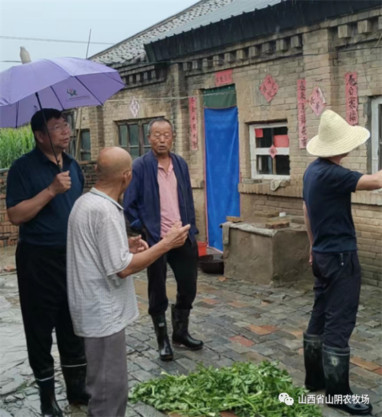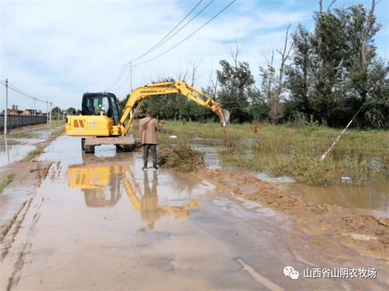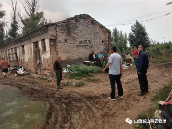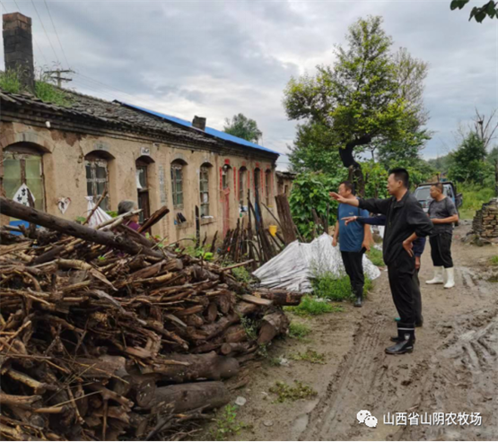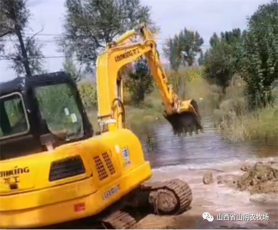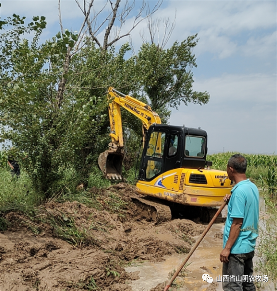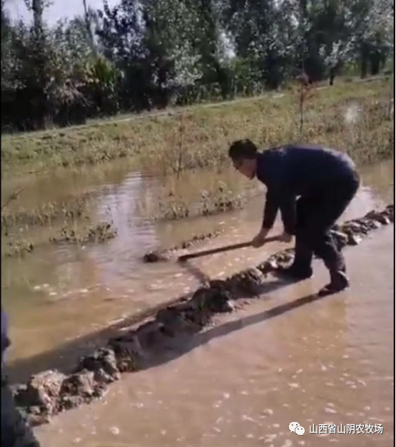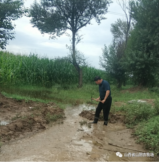 山西省山阴农牧场全体干部职工发扬不怕苦、不怕累、不怕脏、奋勇向前的精神,以场为家,群策群力,全员战斗在抗灾.,全力以赴,勠力同心,克服困难,与雨灾抗战,.我场平安减灾。